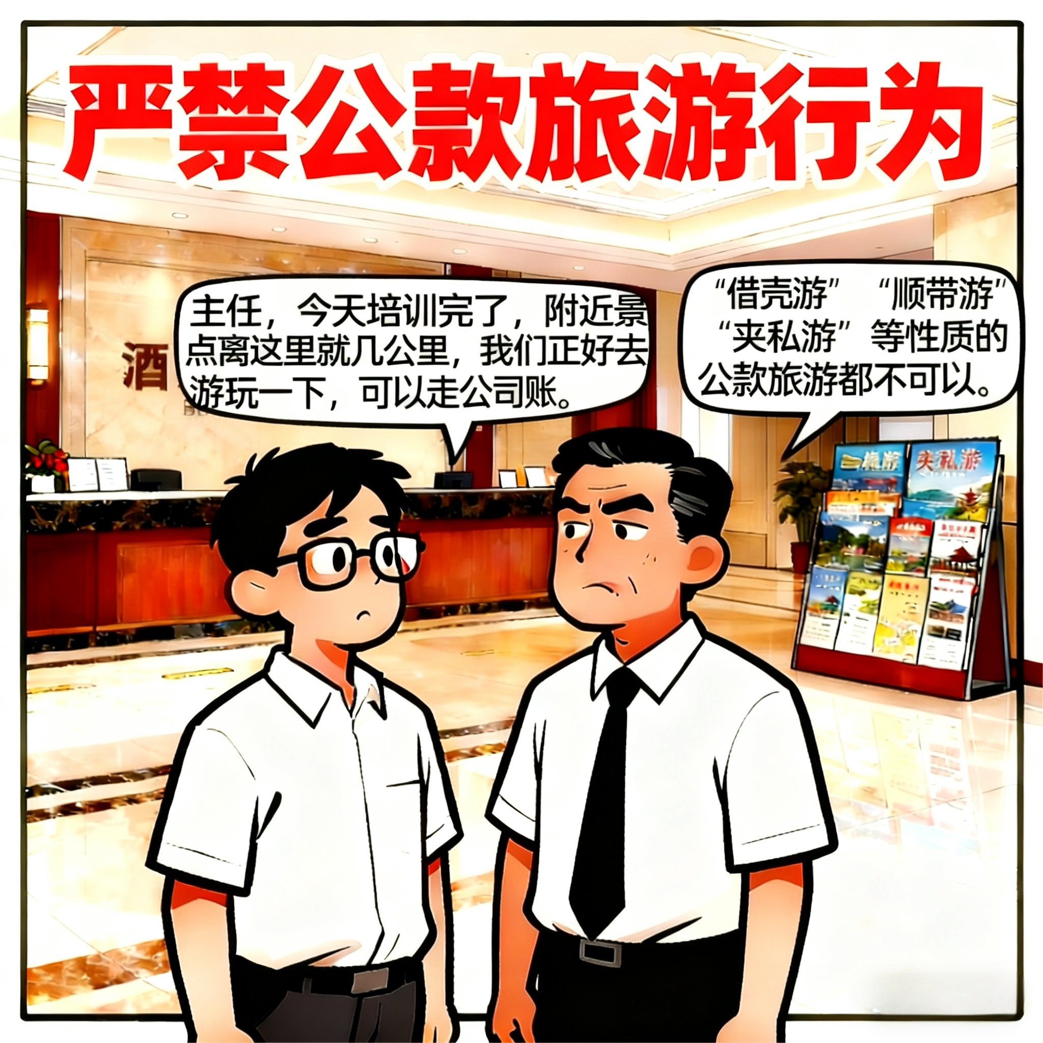 纪法链接 《中国共产党纪律处分条例》第一百一十五条 有下列行为之一,对直接责任者和领导责任者,情节较轻的,给予警告或者严重警告处分;情节较重的,给予撤销党内职务或者留党察看处分;情节严重的,给予开除党籍处分:(一)公款旅游或者以学习培训、考察调研、职工疗养等为名变相公款旅游;(二)改变公务行程,借机旅游;(三)参加所管理企业、下属单位组织的考察活动,借机旅游。以考察、学习、培训、研讨、招商、参展等名义变相用公款出国(境)旅游的,对直接责任者和领导责任者,依照前款规定处理。